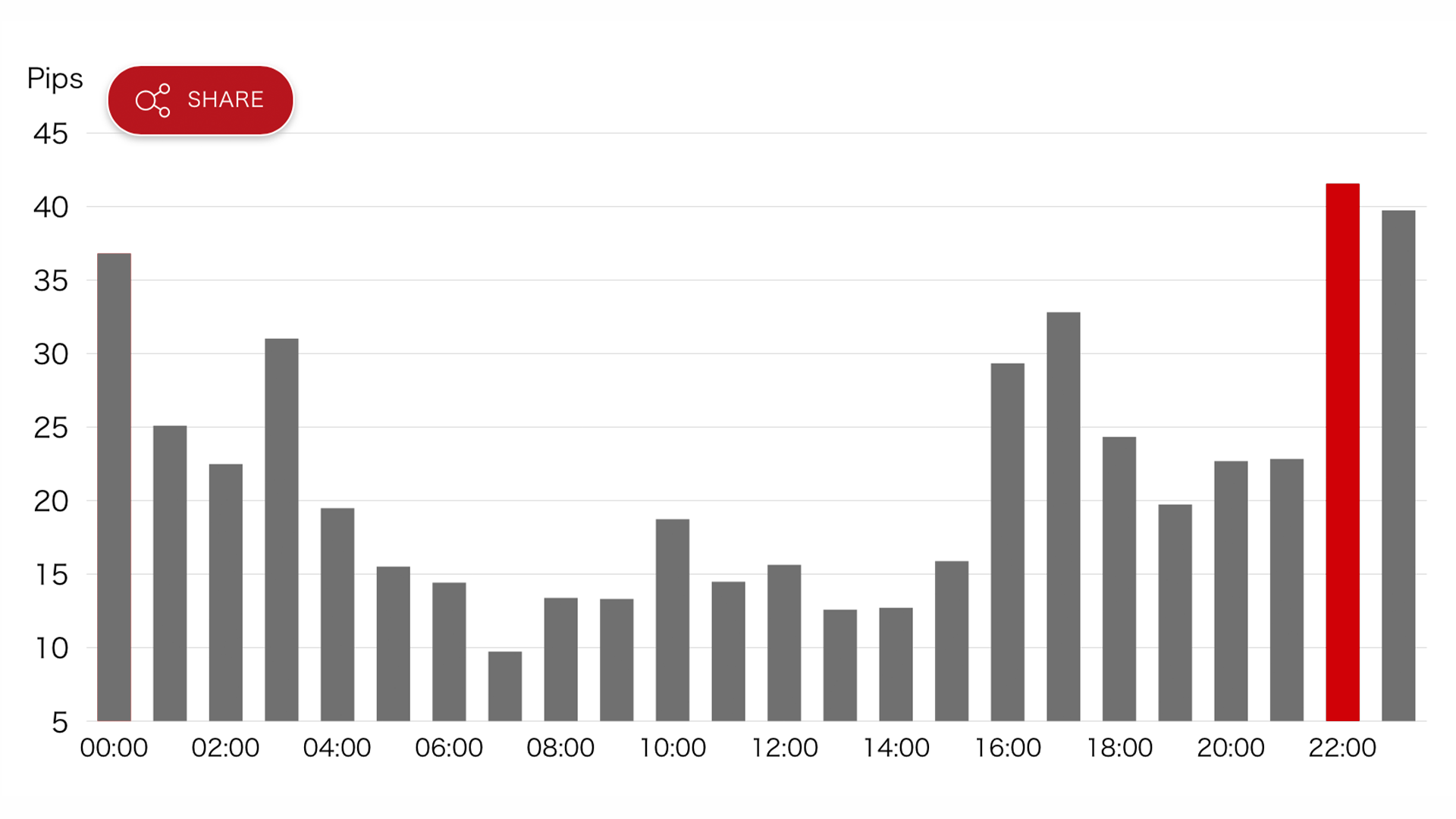 下記のグラフは、時間ごとのUSDJPYのボラティリティ(変動幅)をpips単位で表示しています。