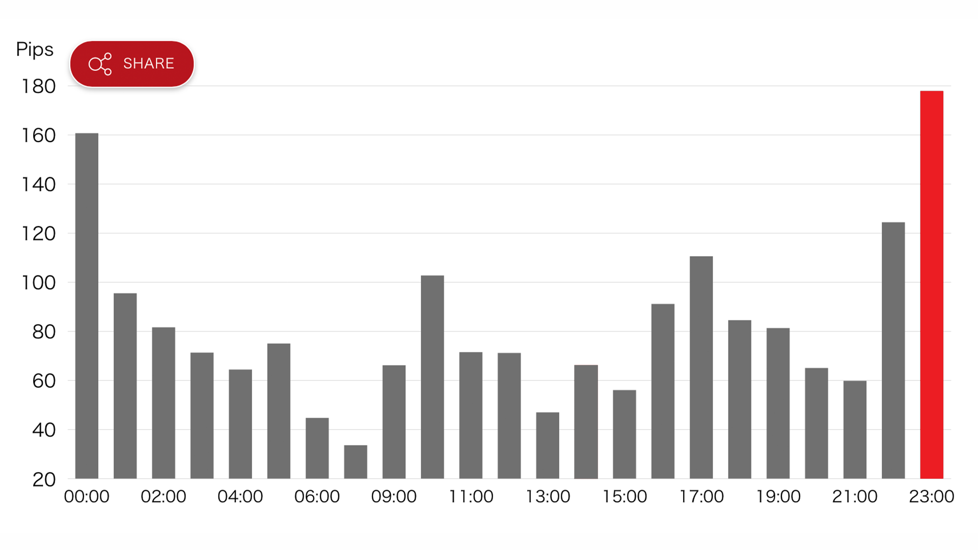 特に高いのは23時〜の時間帯で、170pips以上の変動幅です。
