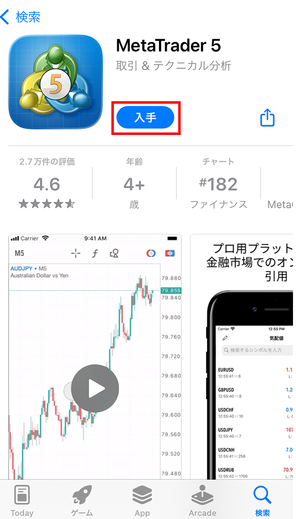 MT5アプリの詳細画面が表示したら、MT5アプリの「入手」ボタンをタップしインストールします。