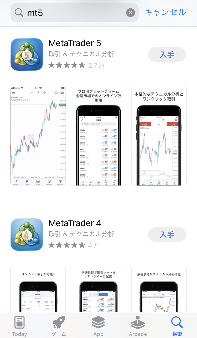 App Storeを開き、「mt5」「MetaTrader5」といったワードで検索します。