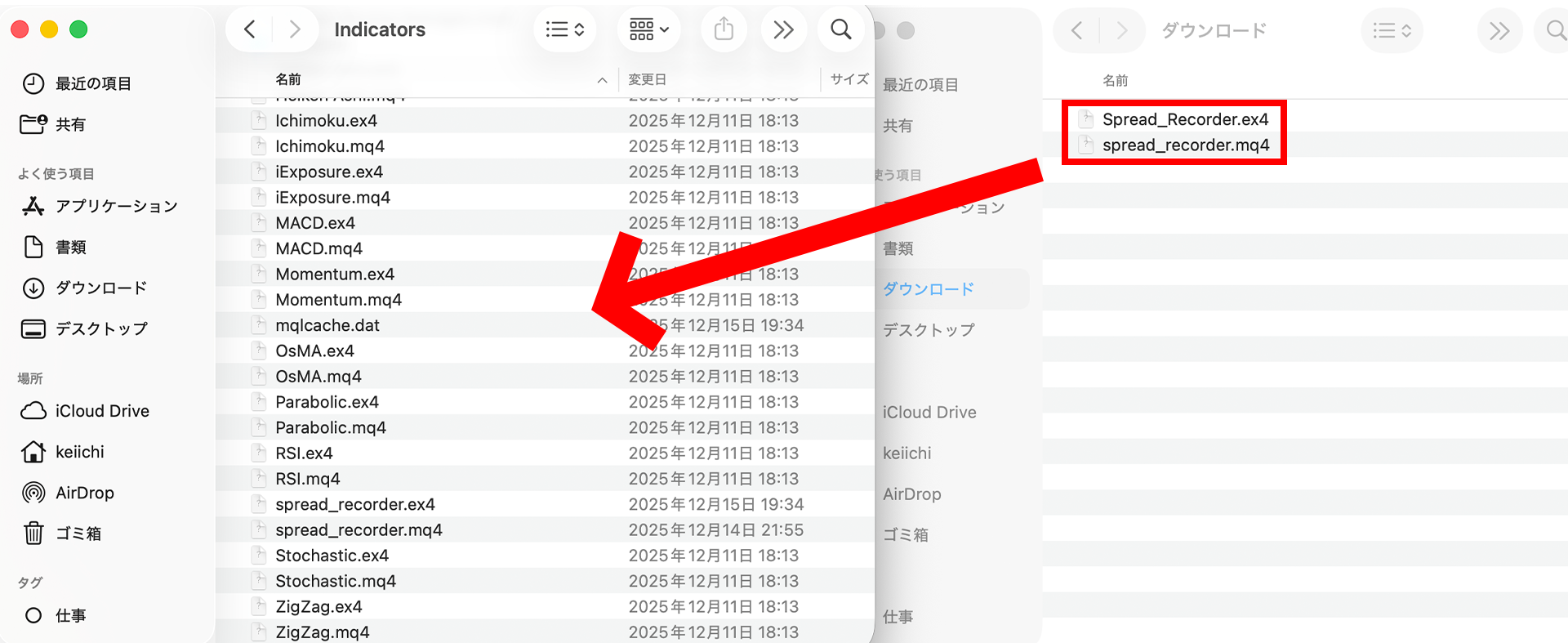 「Indicators」のフォルダが開いたら、この中にカスタムインジケーターをコピーします。