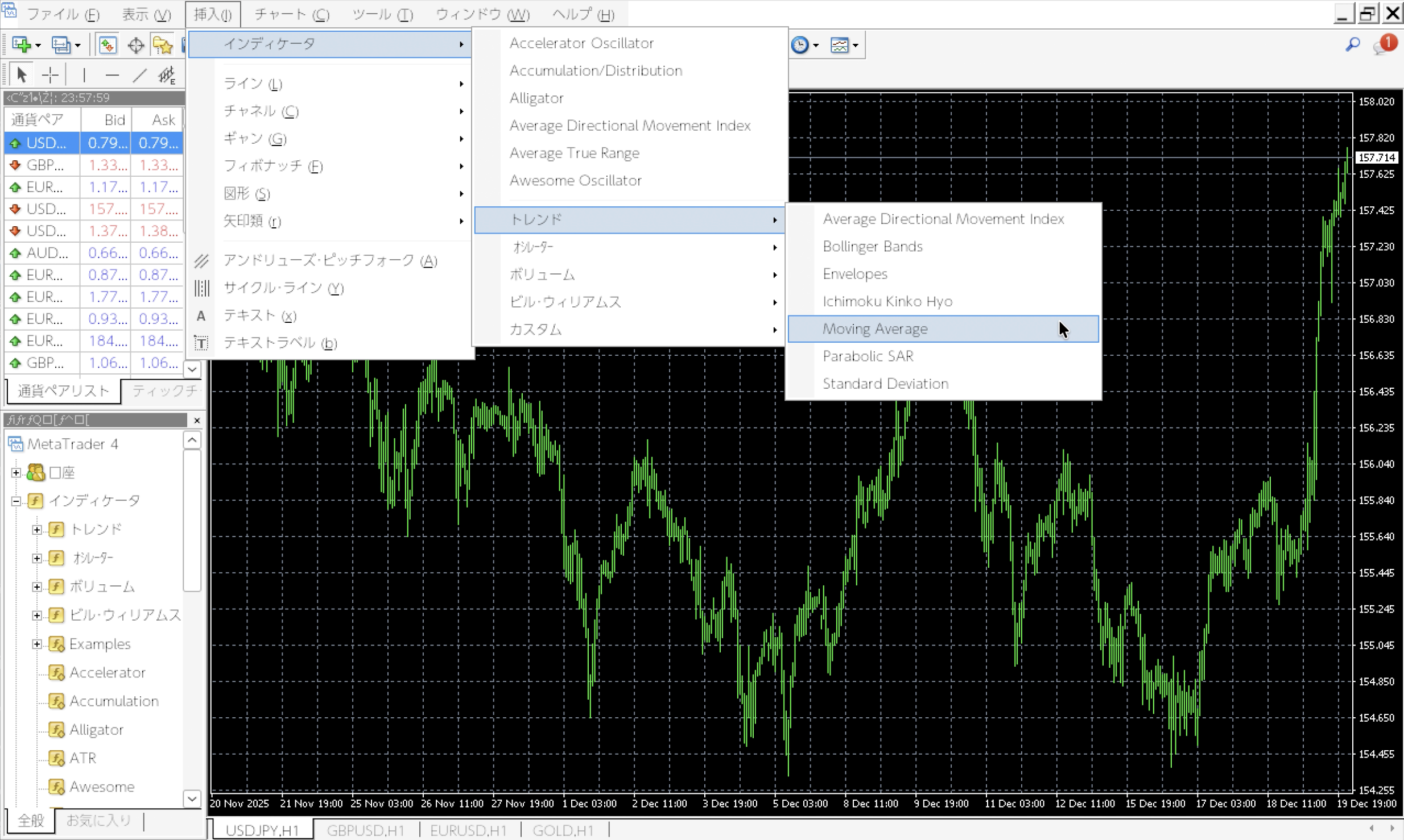 チャート上にインジケーターを表示させる方法は複数ありますが、ここではメニューバーから追加する方法、ナビゲーターから追加する方法の2種類を解説します。