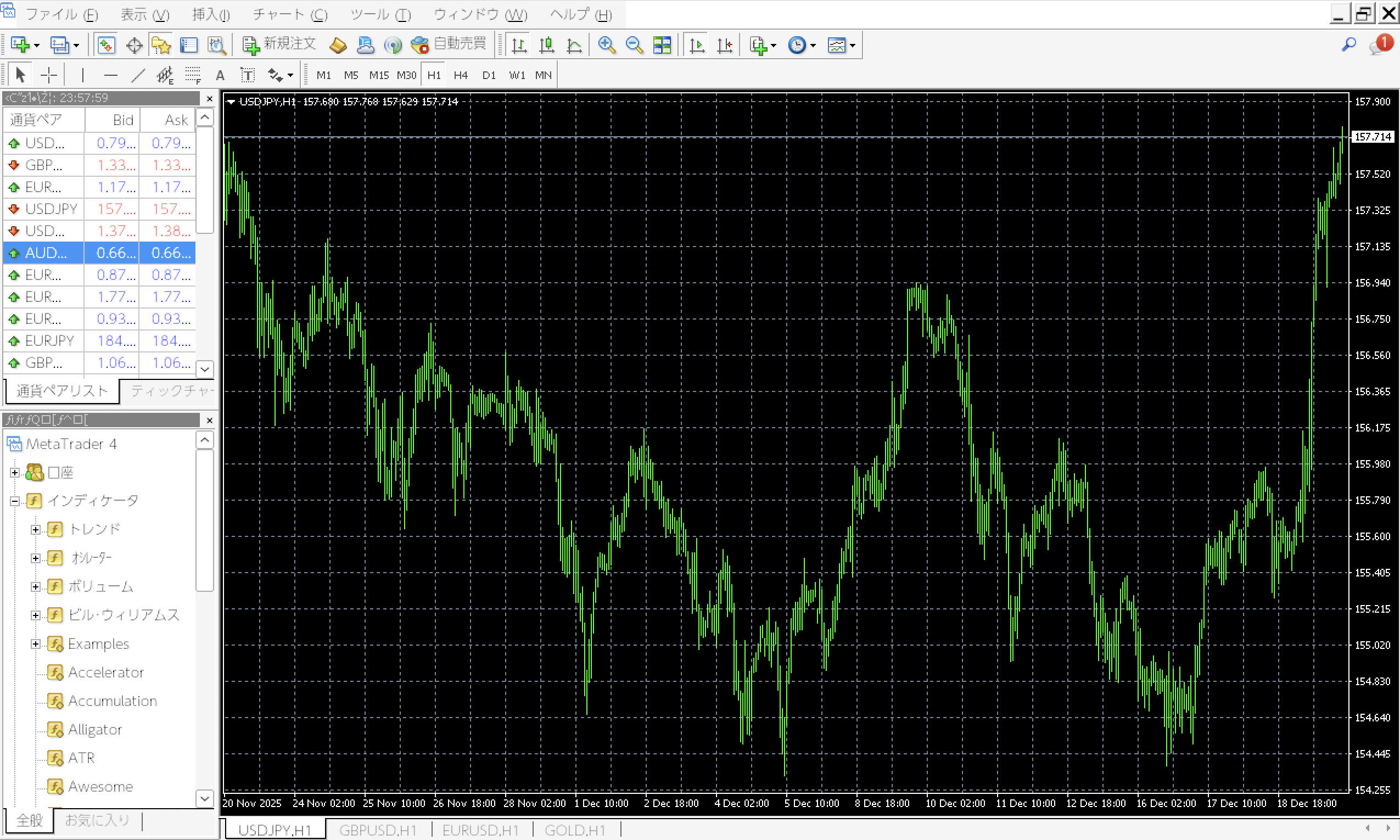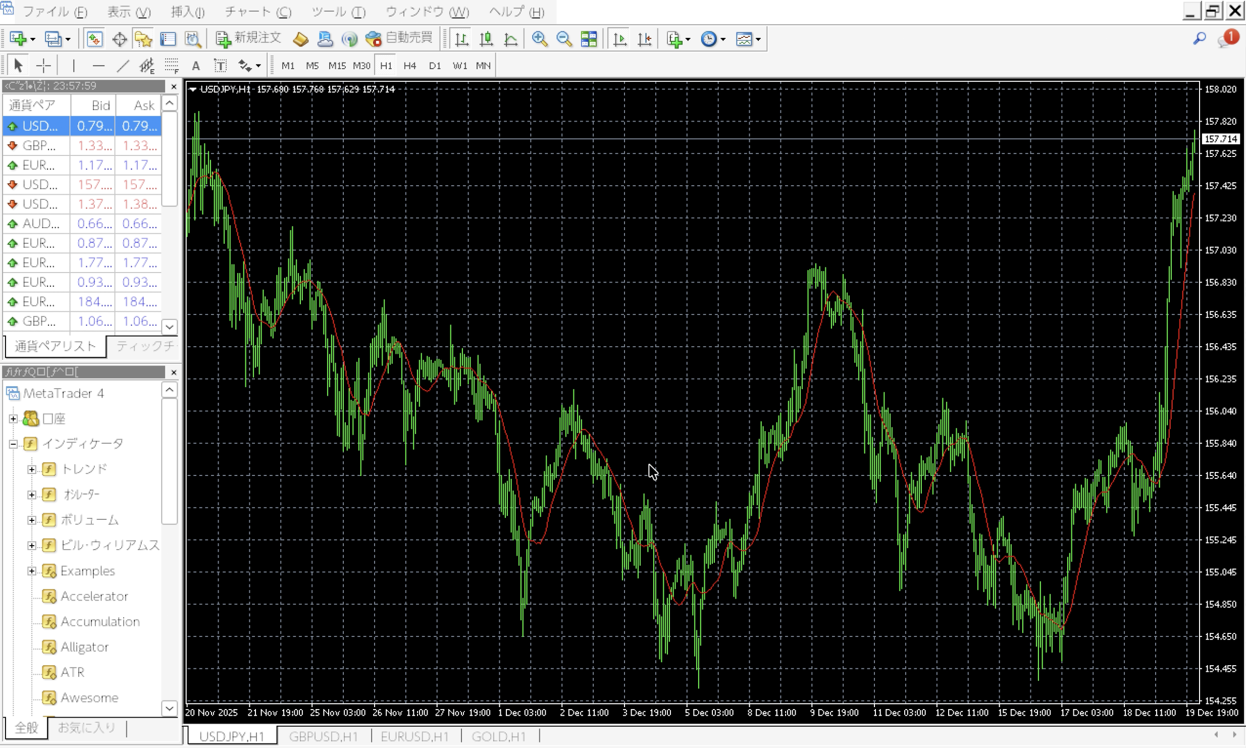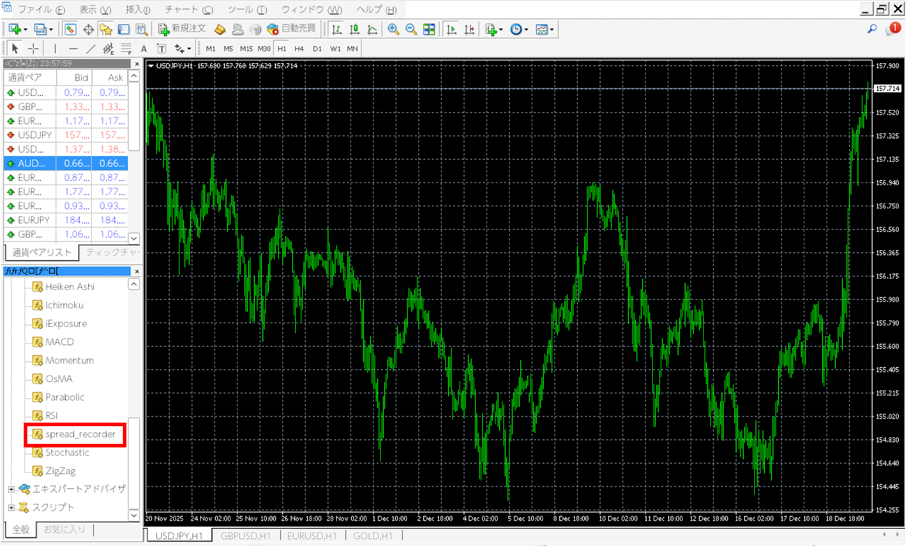 ナビゲーターの項目から、表示させたいインジケーターをダブルクリックまたはドラッグアンドドロップします。