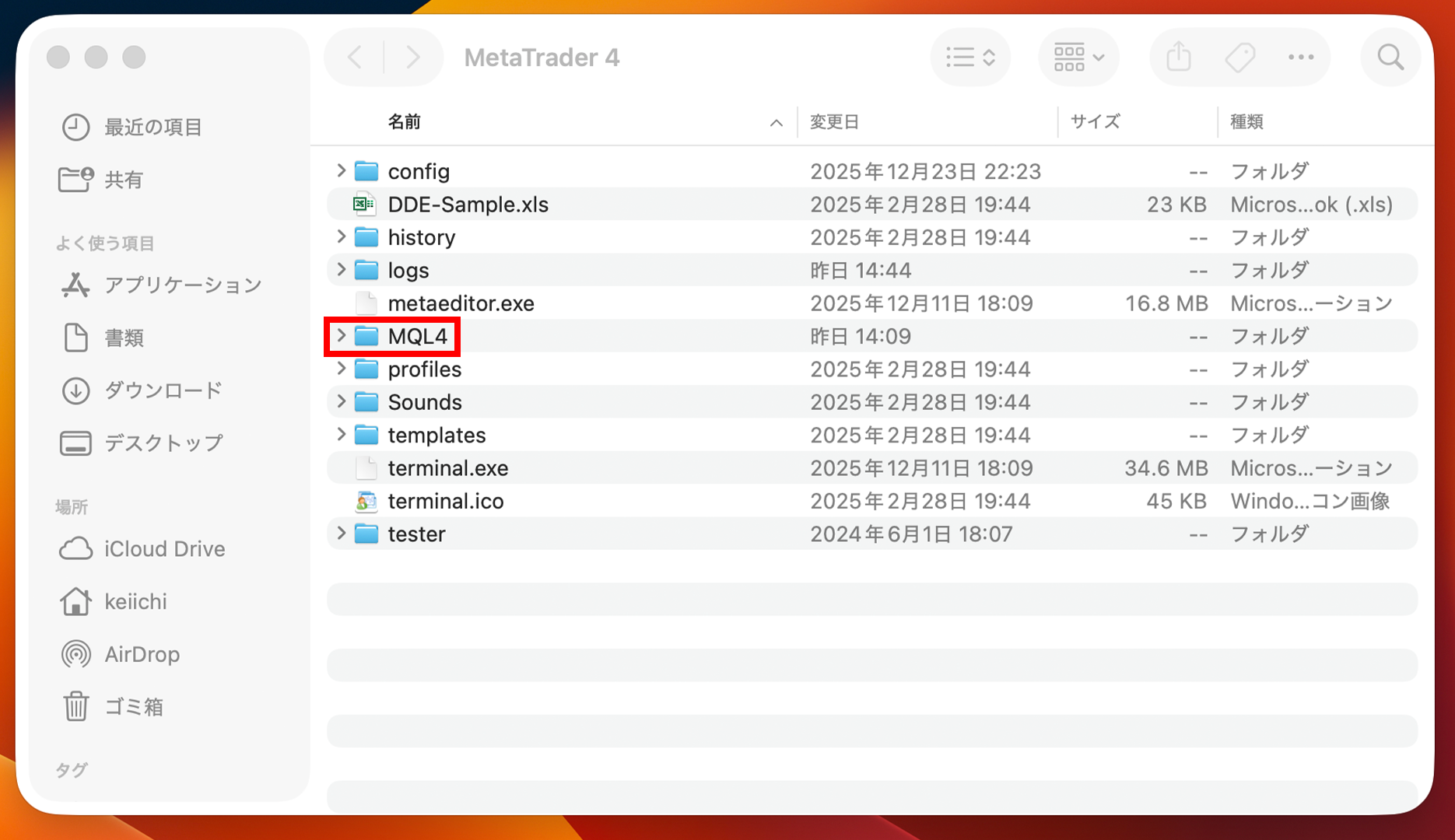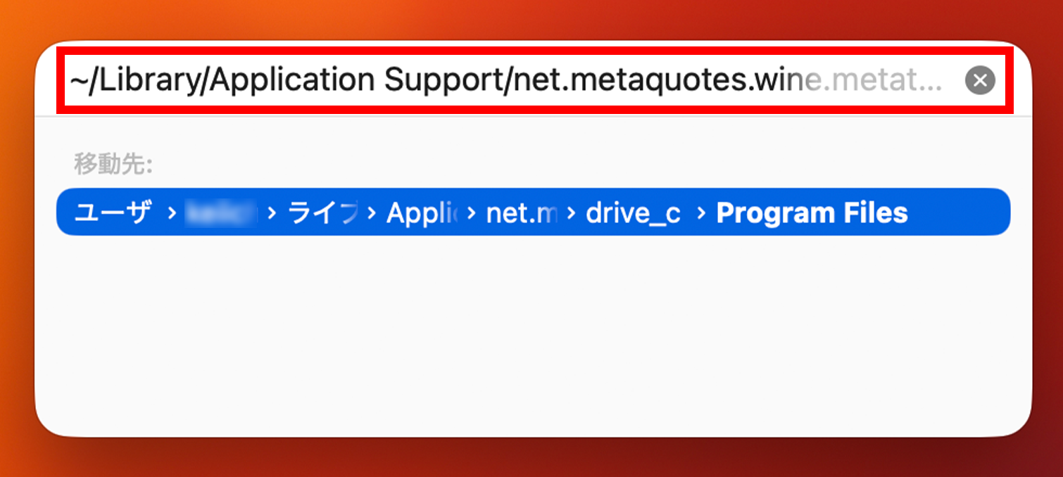 | 検索ワードの「~/Library/Application Support/net.metaquotes.wine.metatrader4/ drive_c/ProgramFiles(x86)/MetaTrader 4」は公式サイトにも表記されていますが、このワードでは移動先の候補が表示されない可能性もあります。 その時は、「~/Library/Application Support/net.metaquotes.wine.metatrader4/ drive_c/ProgramFiles(x86)」など検索ワードを減らして試してみてください。 |