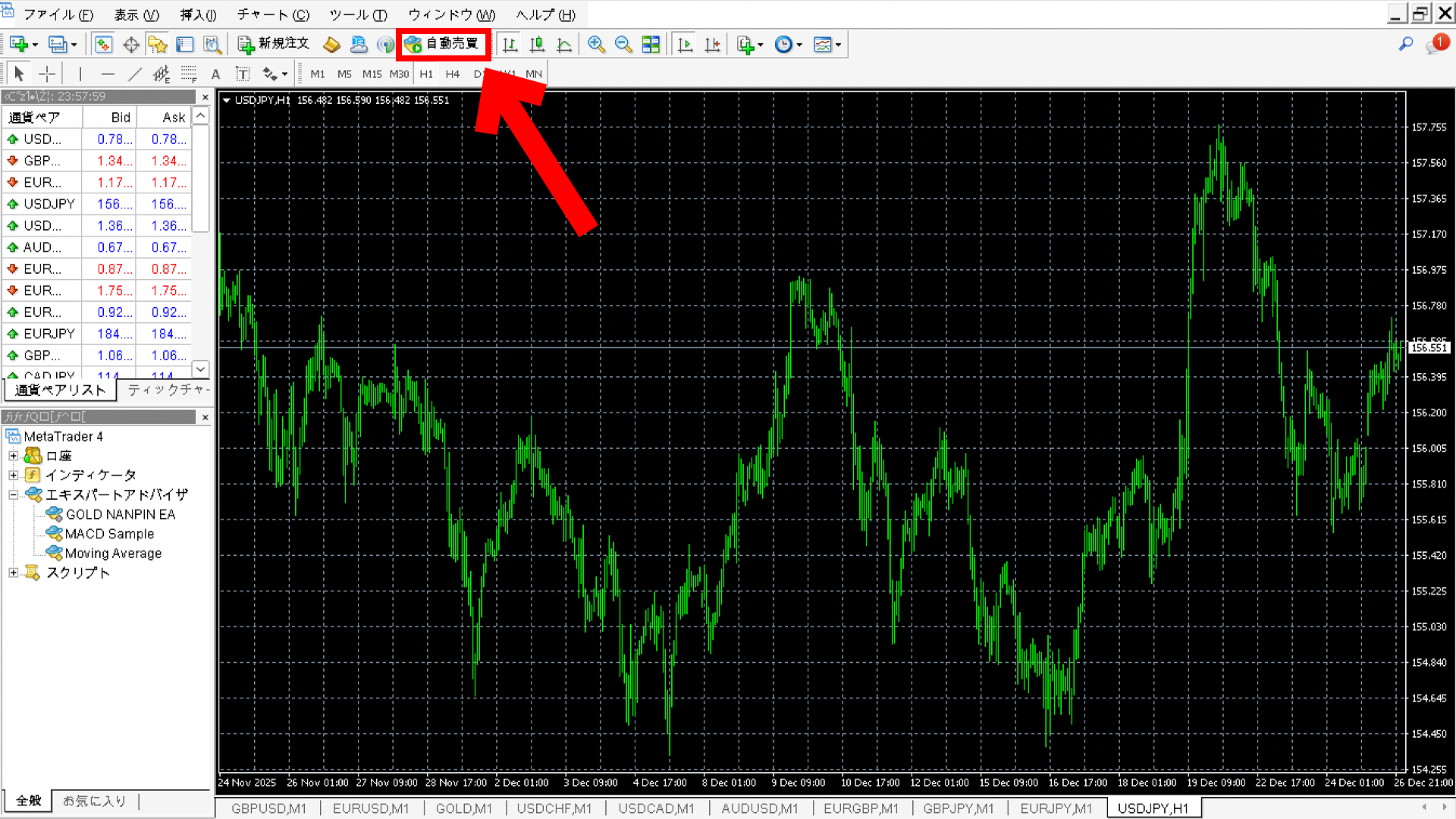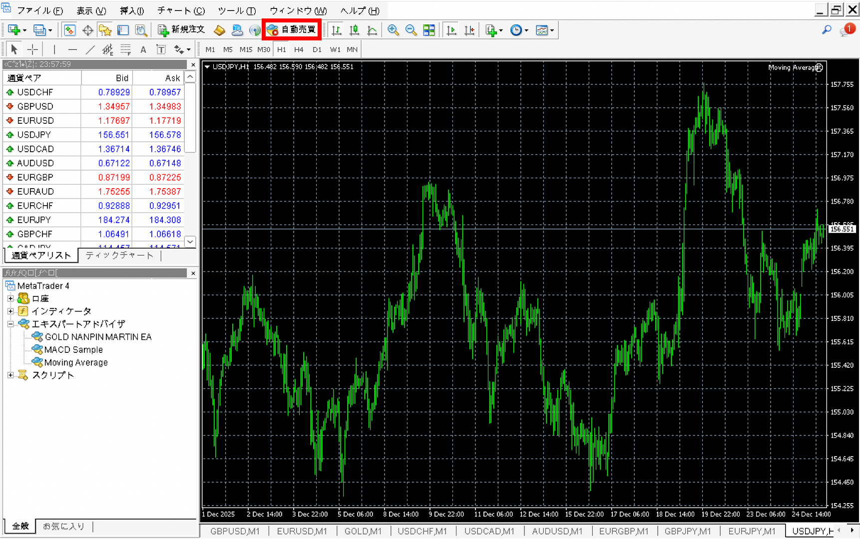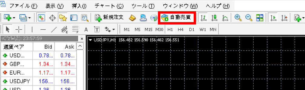 EAを停止する場合は、ツールバーの「自動売買」ボタンをクリックします。