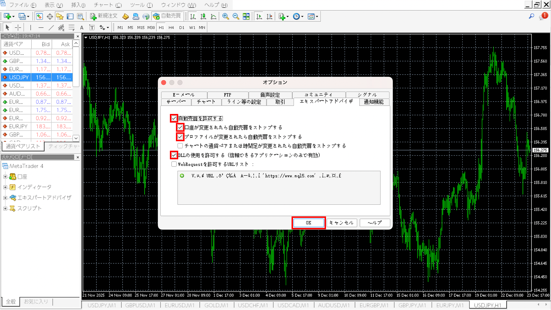「エキスパートアドバイザー」タブを選択し、「自動売買を許可する」「DLLの使用を許可する(信頼できるアプリケーションのみで有効)」のチェックボックスにチェックを入れて「OK」をクリックします。