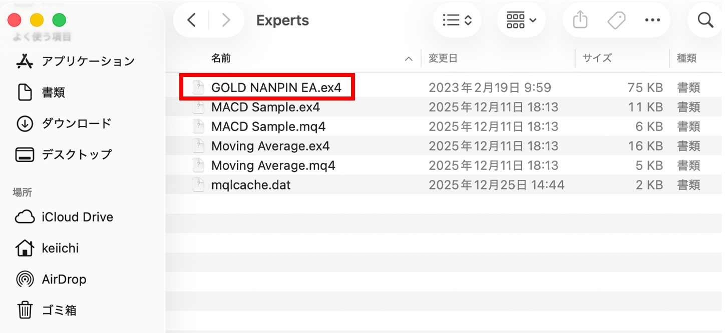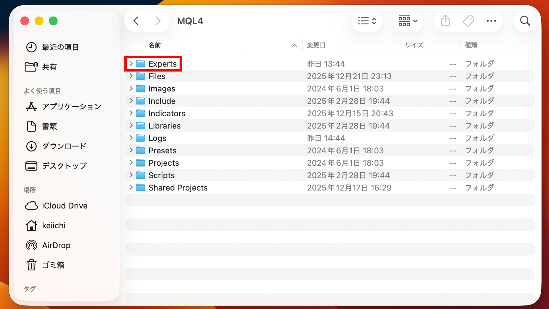 「Experts」フォルダの中に、EAが入ったことを確認してください。