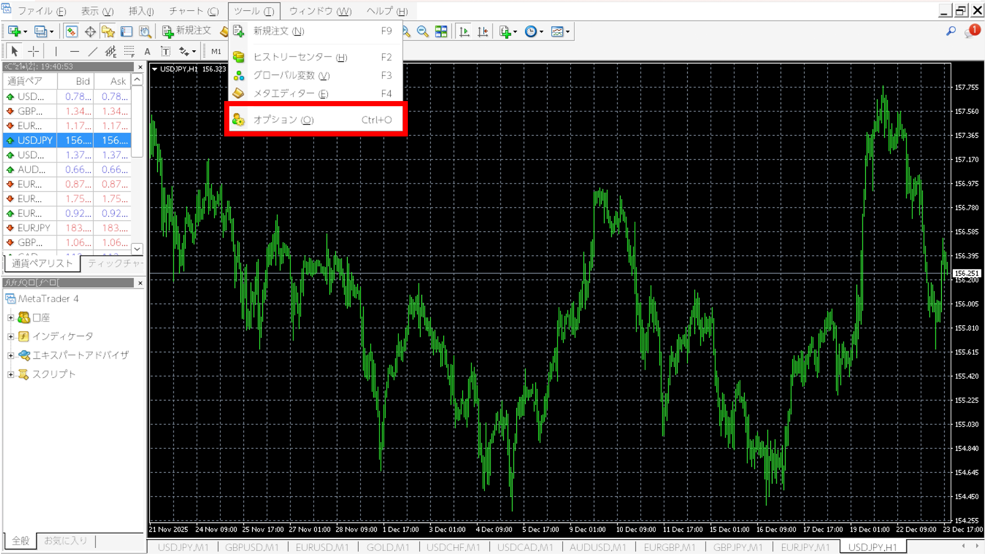 MT4を起動して、メニューバーの「ツール」から「オプション」をクリックします。