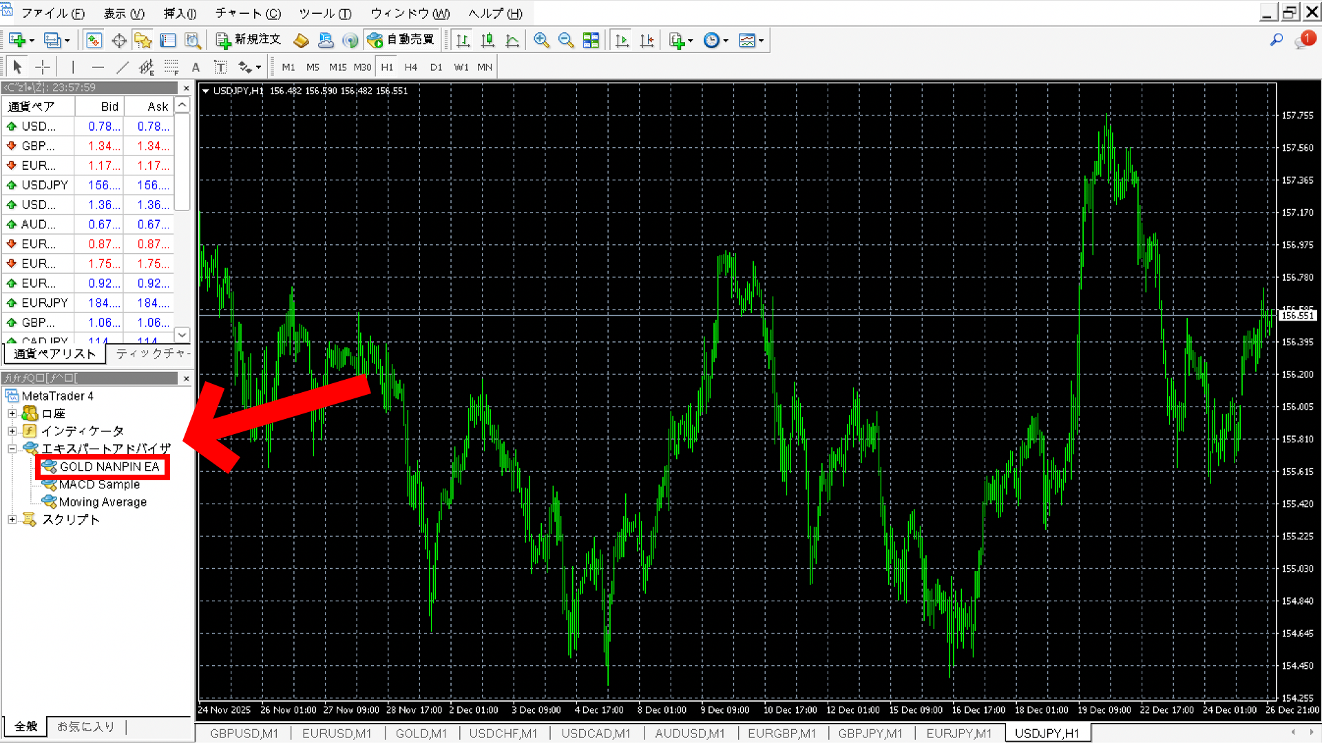 ナビゲーター内のエキスパートアドバイザーを表示させると、先ほどインストールしたEAが追加されています。
