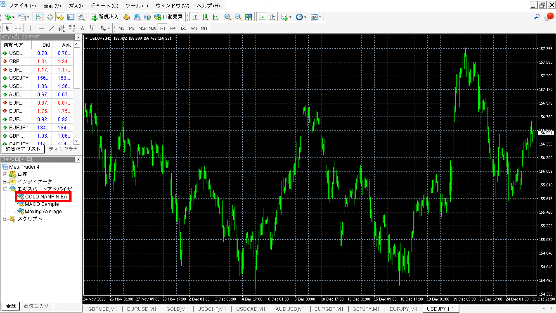 自動売買を開始するには、使用したいEAをダブルクリックもしくはチャート上にドラッグ&ドロップします。