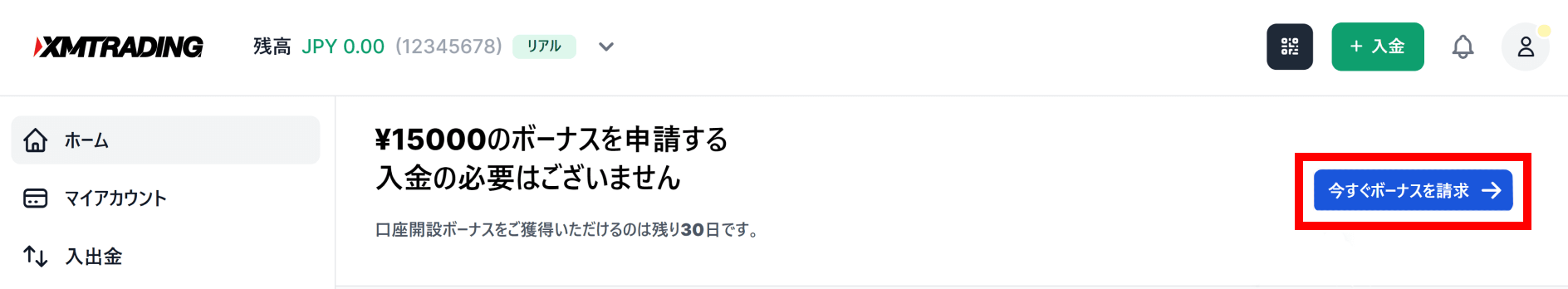 新規口座開設ボーナスは、XMの口座開設から30日以内に、「XM 会員ページ」よりボーナスの請求を行う必要があります。30日を過ぎてしまうと口座開設ボーナスを受け取ることができなくなります。