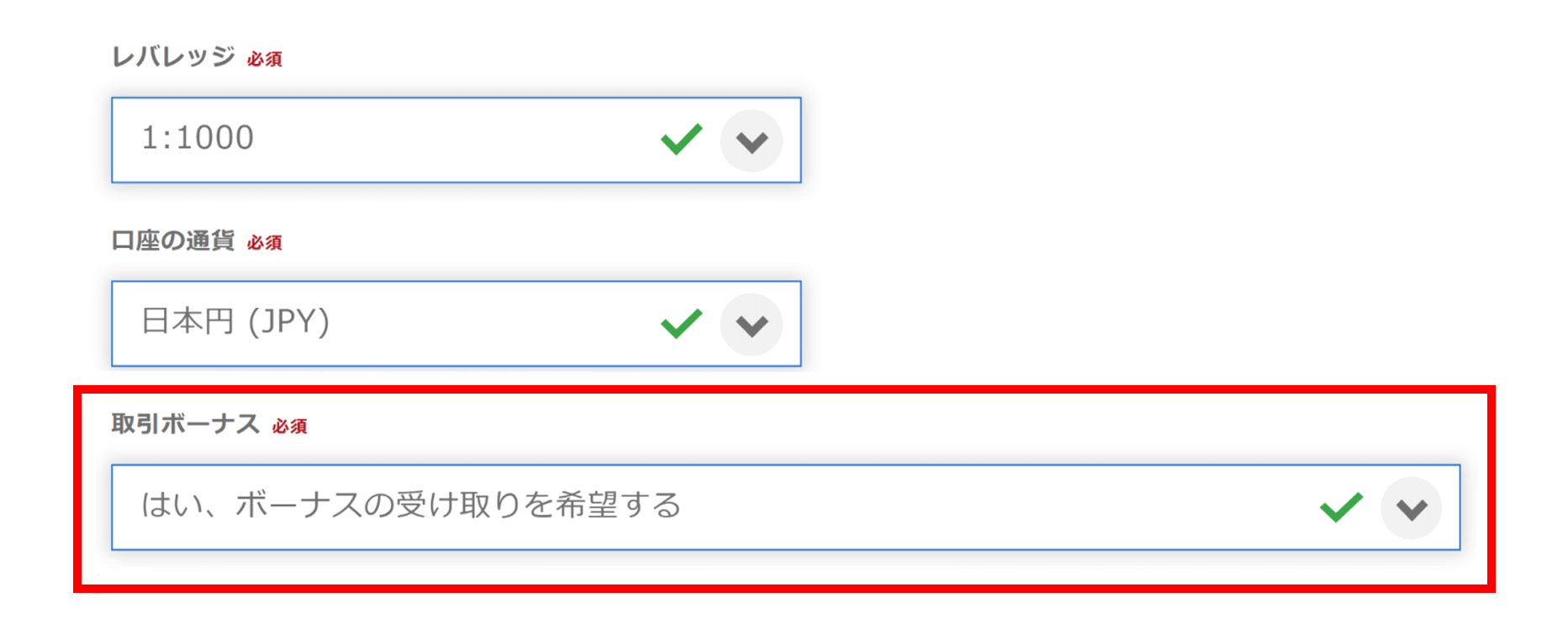 新規口座開設の際に、取引口座詳細の「取引ボーナス」設定メニューで「はい、ボーナスの受け取りを希望する」を選択します。