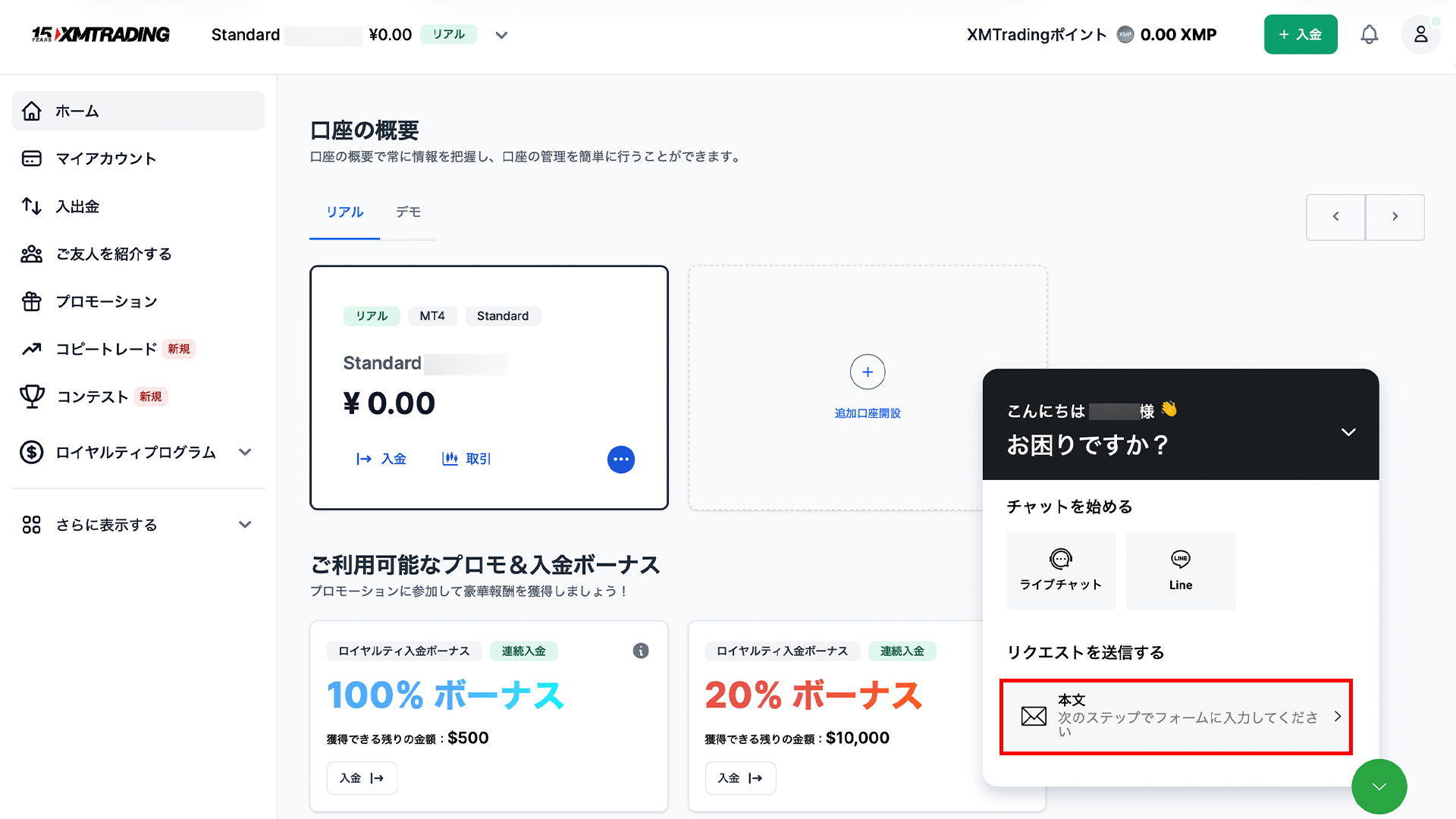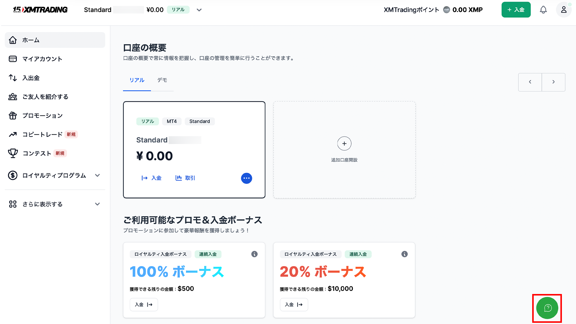 XMの会員ページにログインして、右下の緑色のマークをクリックします。