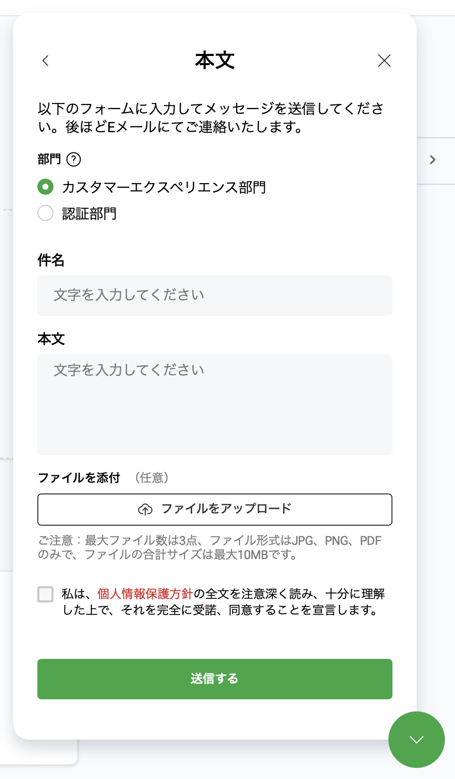 また、ファイルを添付することもできます。(最大ファイル数は3点、ファイル形式は、JPG、PNG、PDFのみで、ファイルの合計サイズは最大10MBです。)