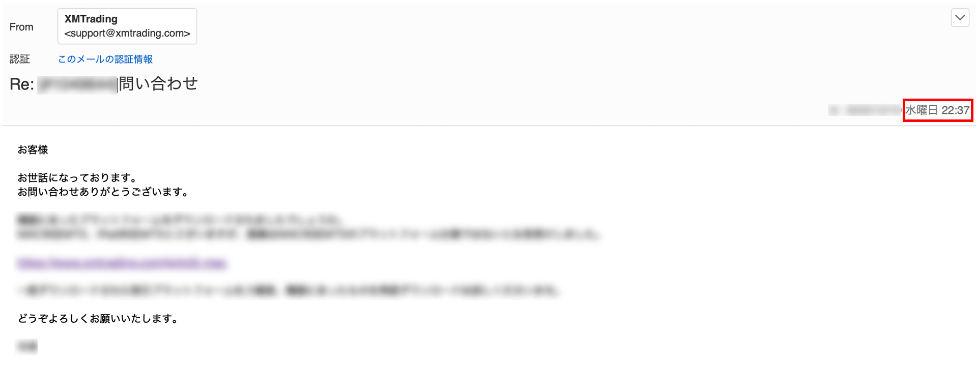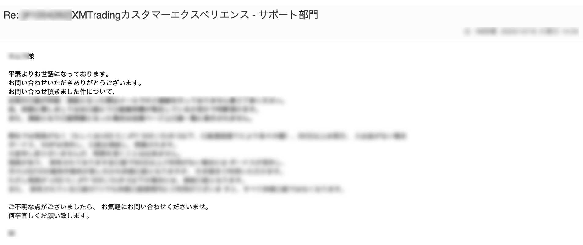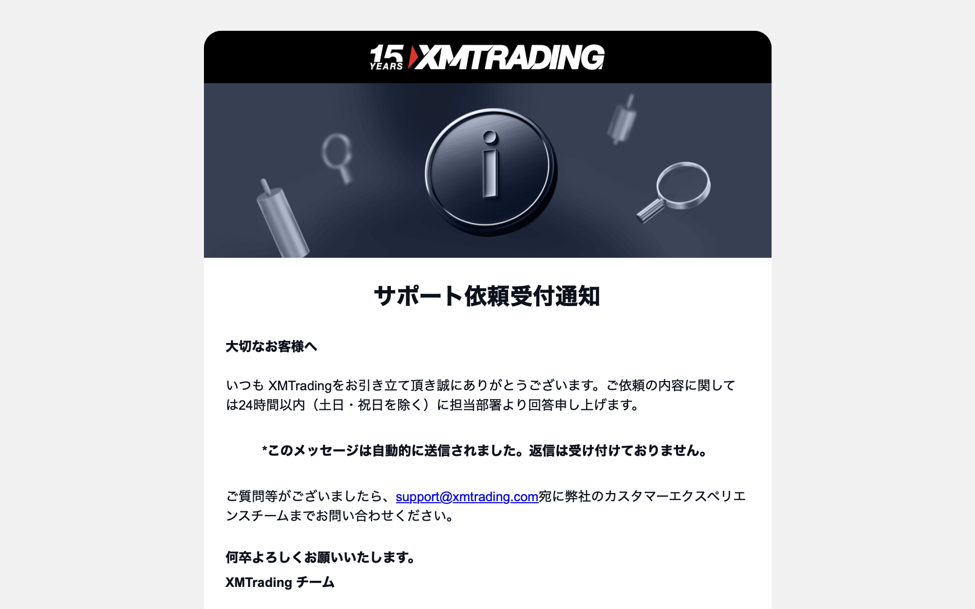 問合せメールの送信が完了すると、XMから「サポート依頼受付通知」というタイトルのメールが届きます。