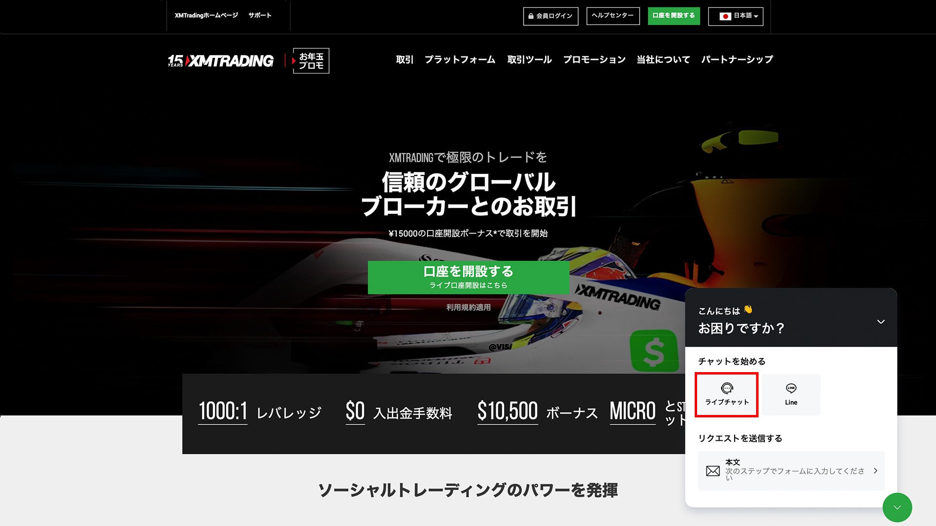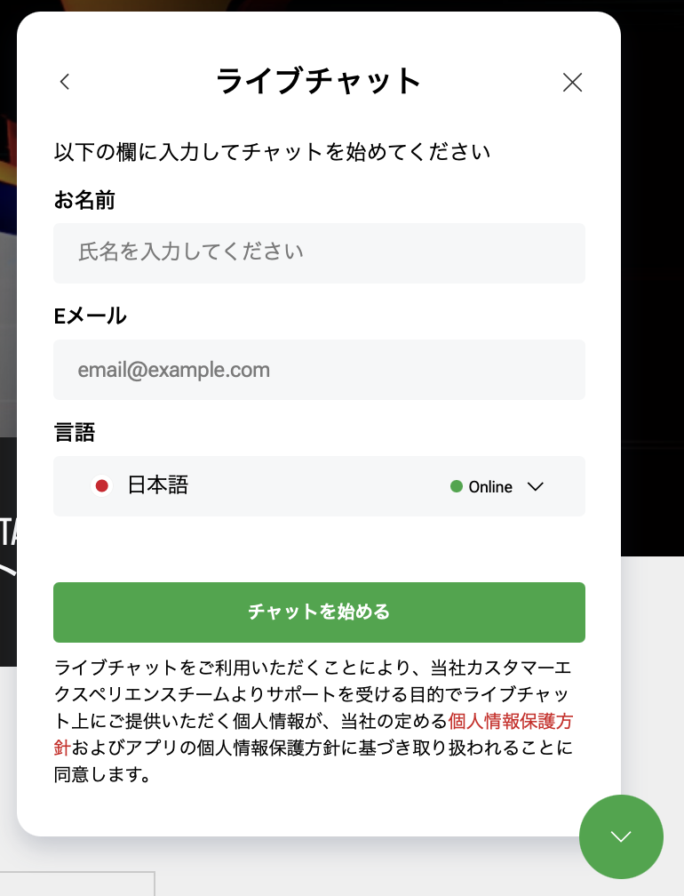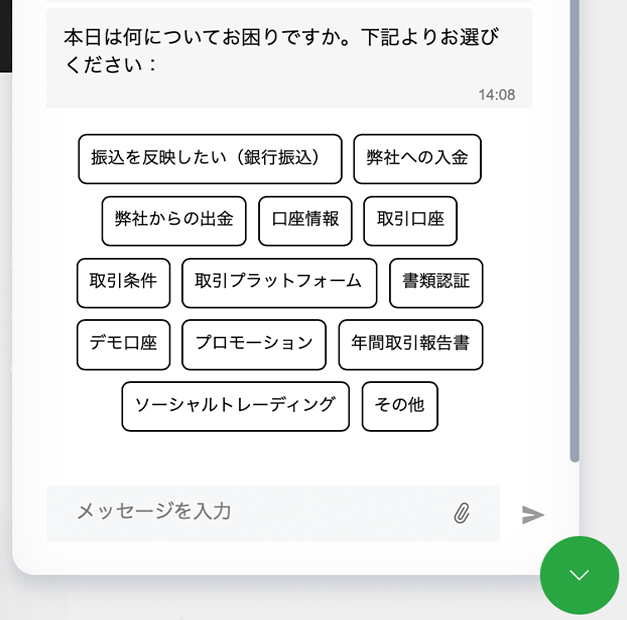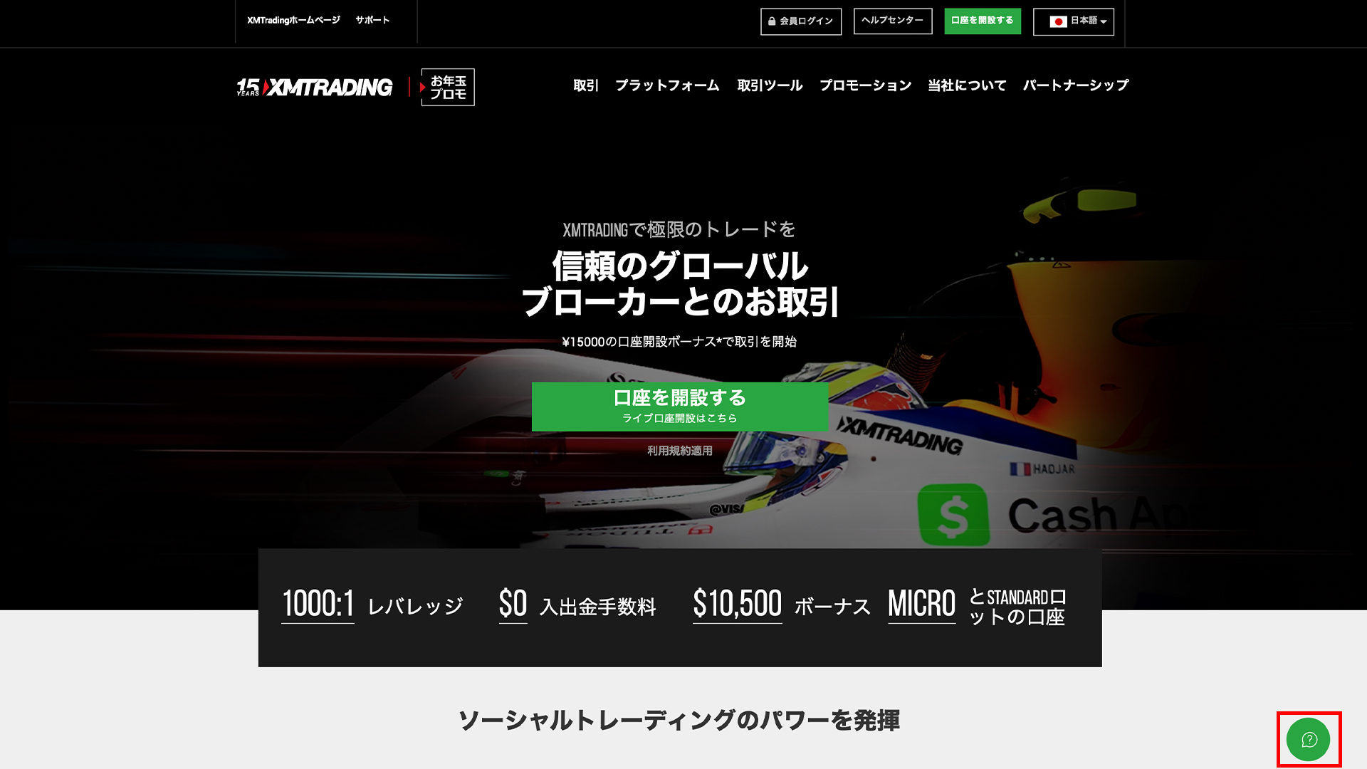 XMのトップページの右下の緑色のアイコンをクリックします。