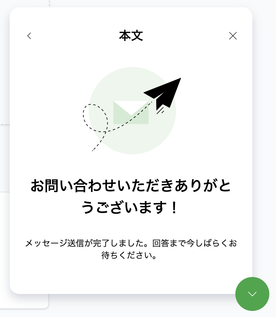 メールを問題なく送信できれば、「お問い合わせいただきありがとうございます!メッセージ送信が完了しました。回答まで今しばらくお待ちください。」と表示されます。