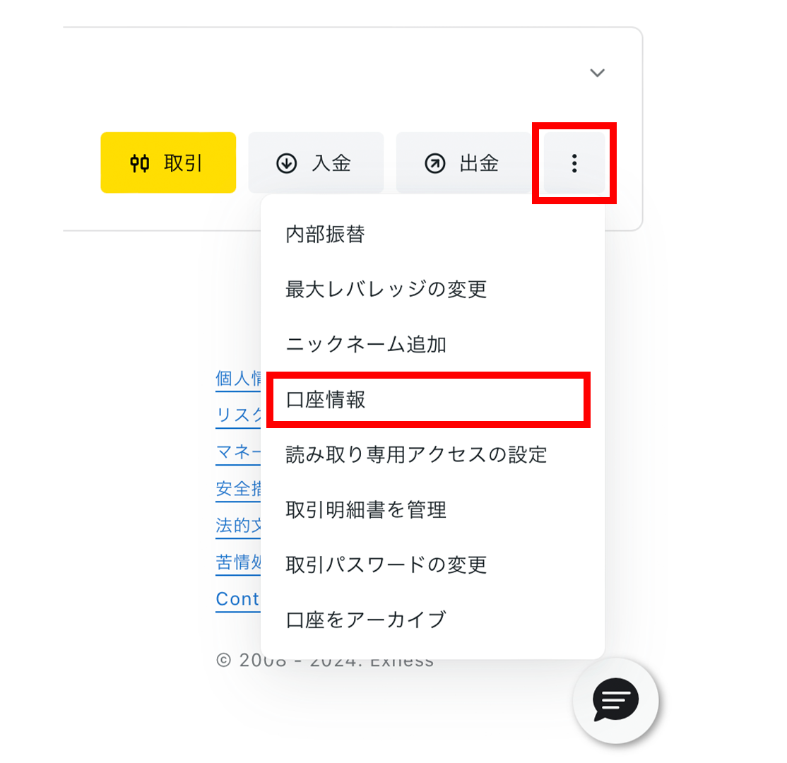 レバレッジを確認したい取引口座の「︙ 」をクリックし、「口座情報」を選択します。