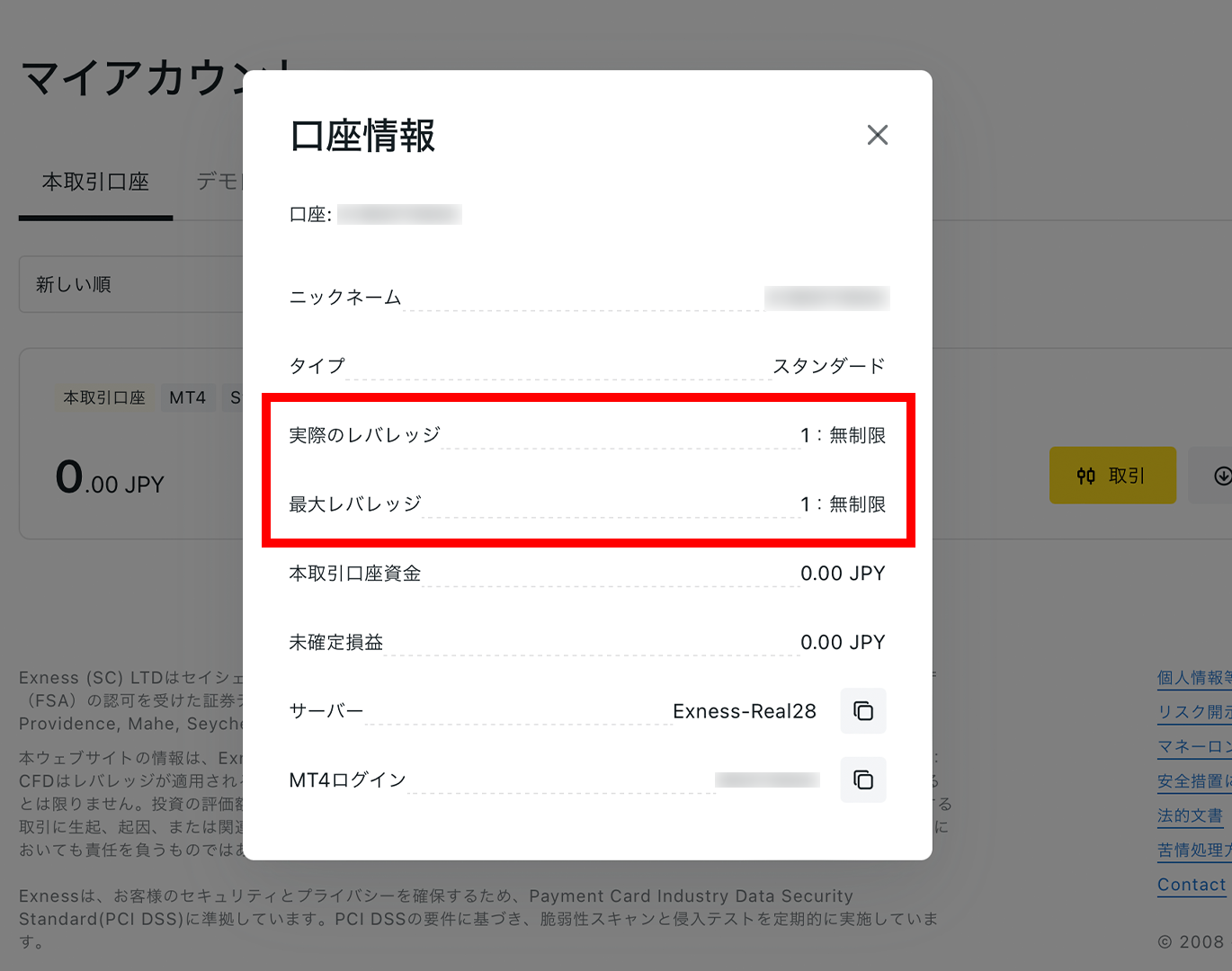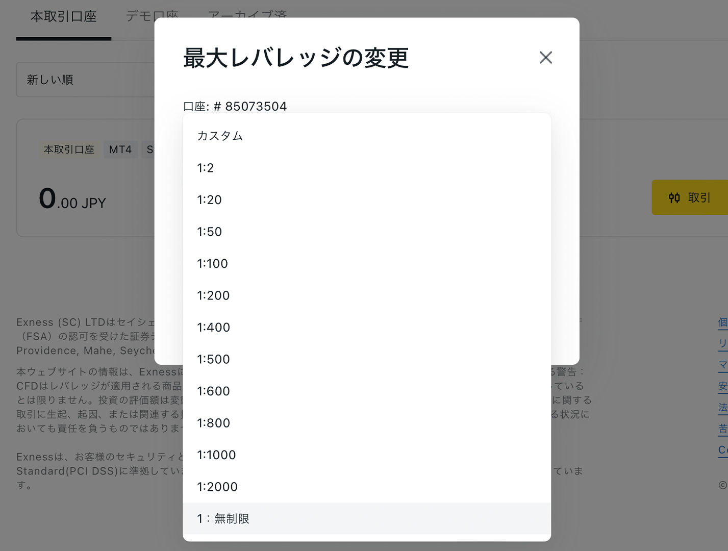 Exnessでは、口座残高(有効証拠金)によってレバレッジが制限されます。