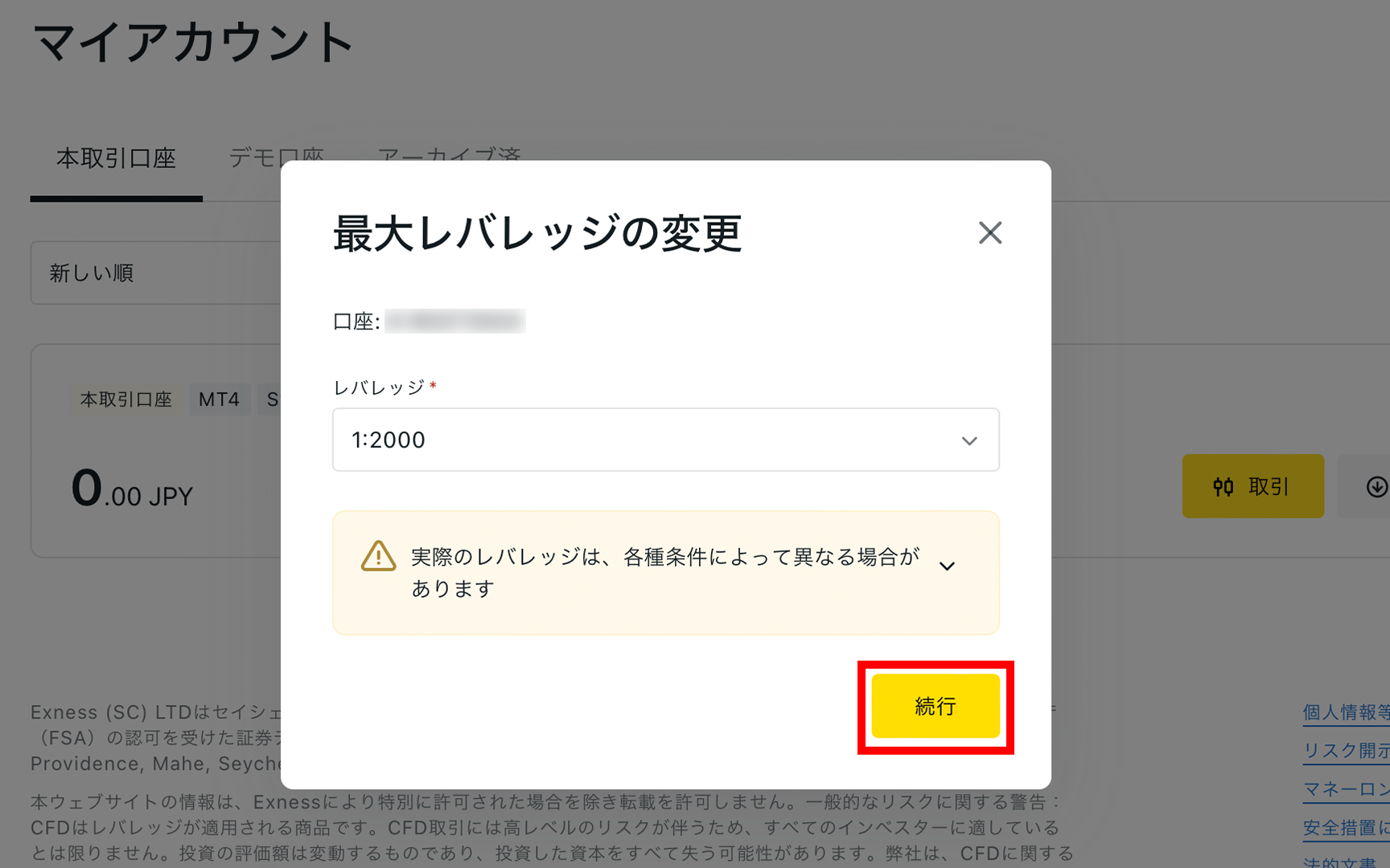 最大レバレッジを選択したら、最後の「続行」をクリックします。