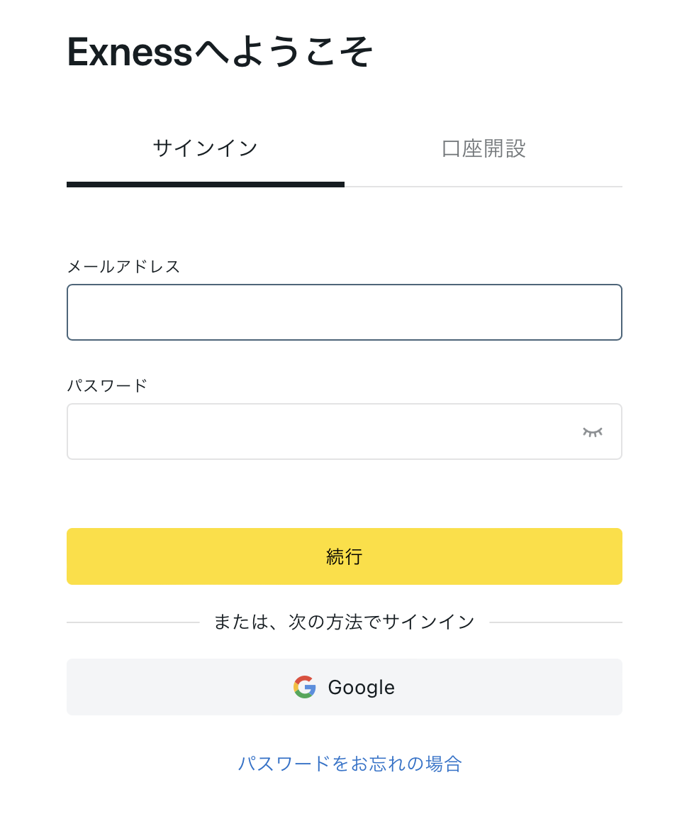 Exnessのログインページから、メールアドレスとパスワードを入力してログインします。