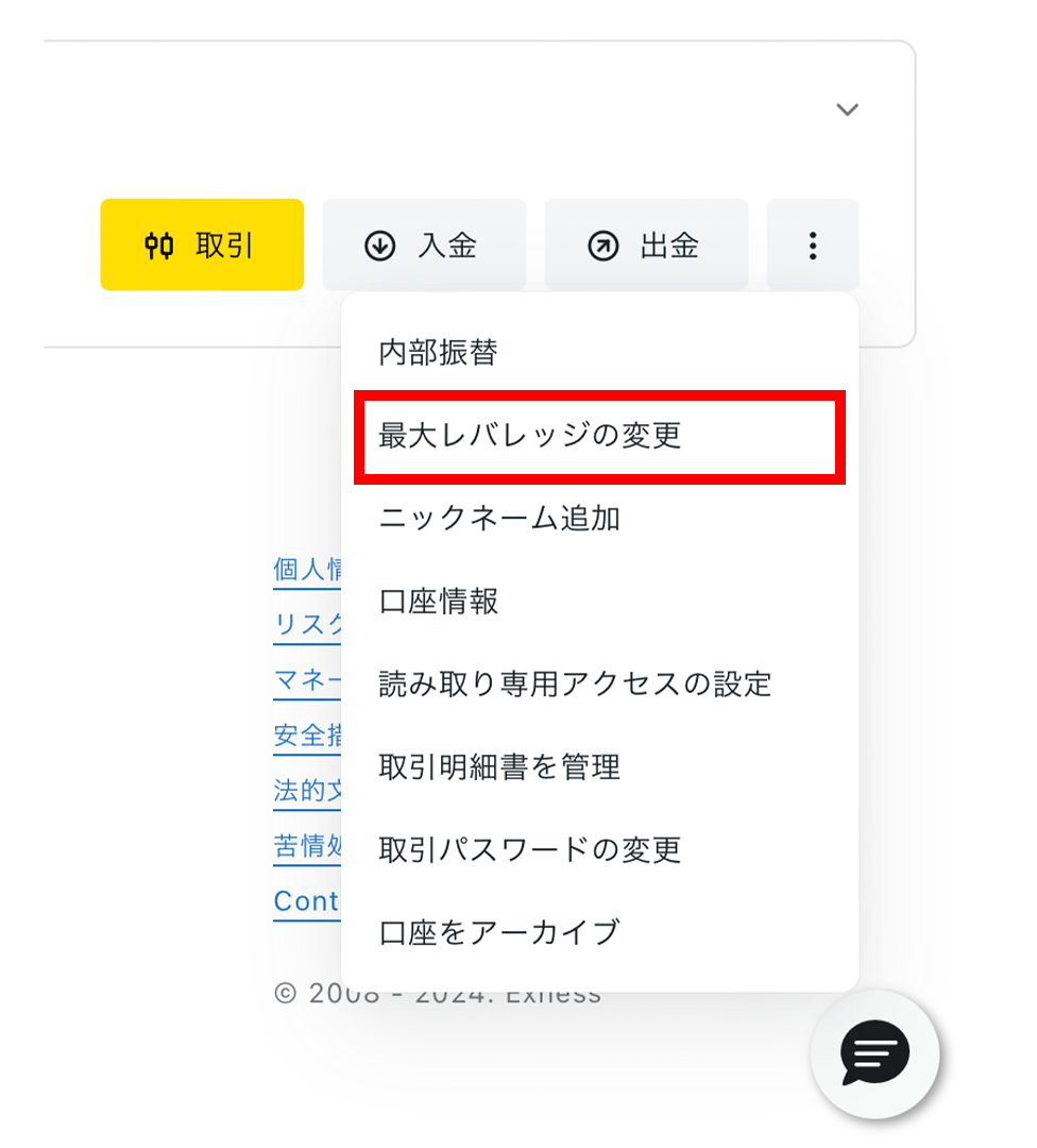 レバレッジを変更したい取引口座の「︙ 」をクリックし、「最大レバレッジの変更」を選択します。