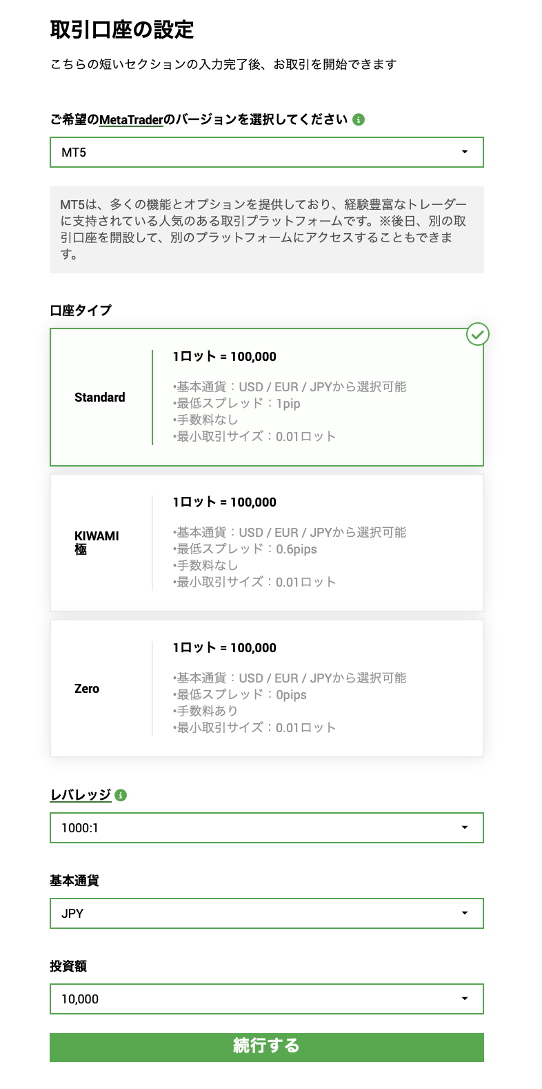 「最初のデモ口座を作成」をクリックすると、デモ口座の詳細を設定する画面が表示されるので、希望する設定を選択します。