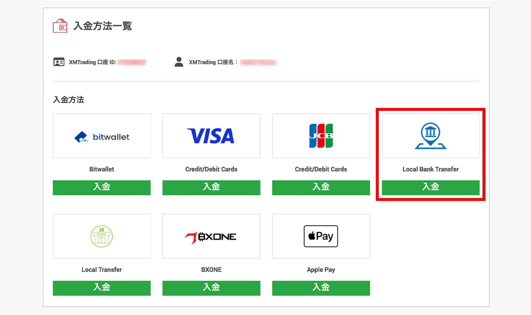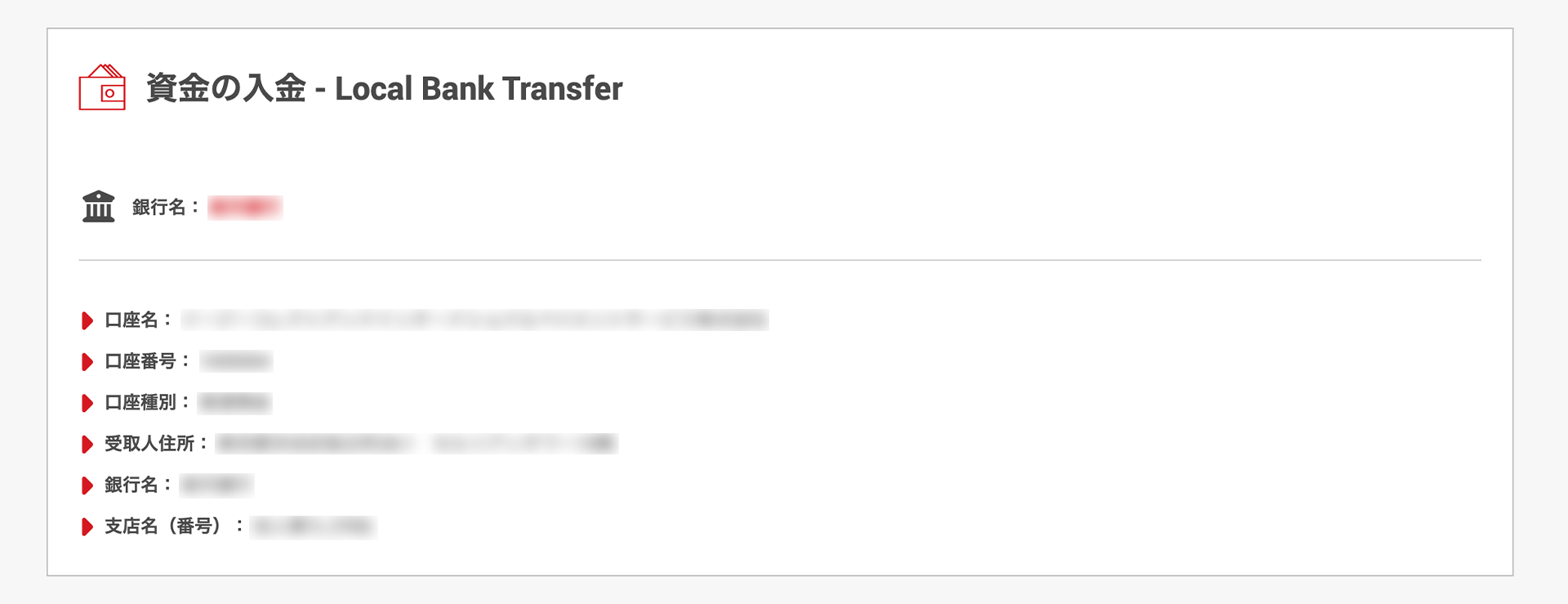 入金手続きの際は、会員ページ内の入金ページ「Local Bank Transfer」にて表示される注意事項を含め、振込先情報を確認してください。