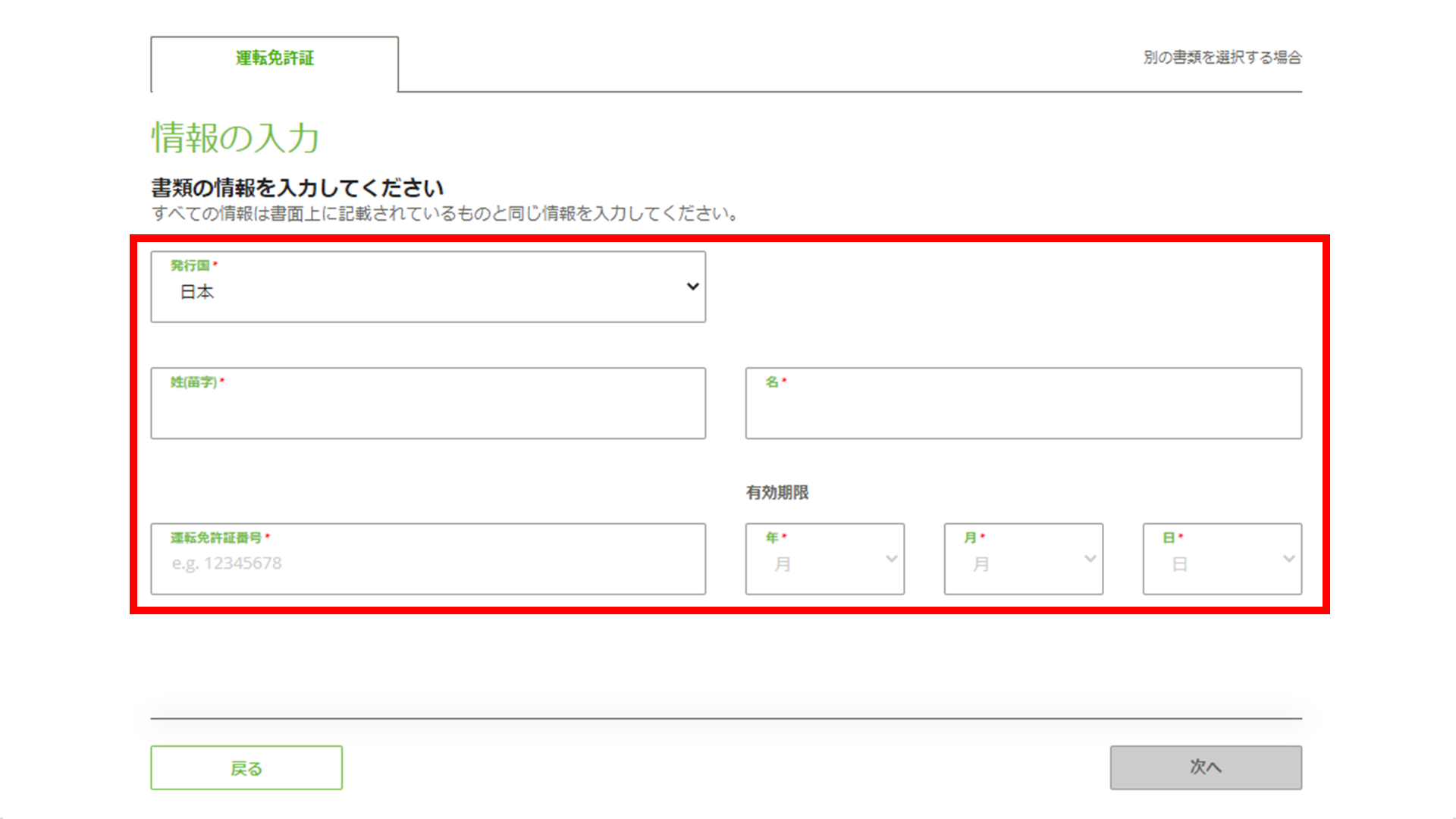 下記の画像は、運転免許証を選択した場合の入力画面です。