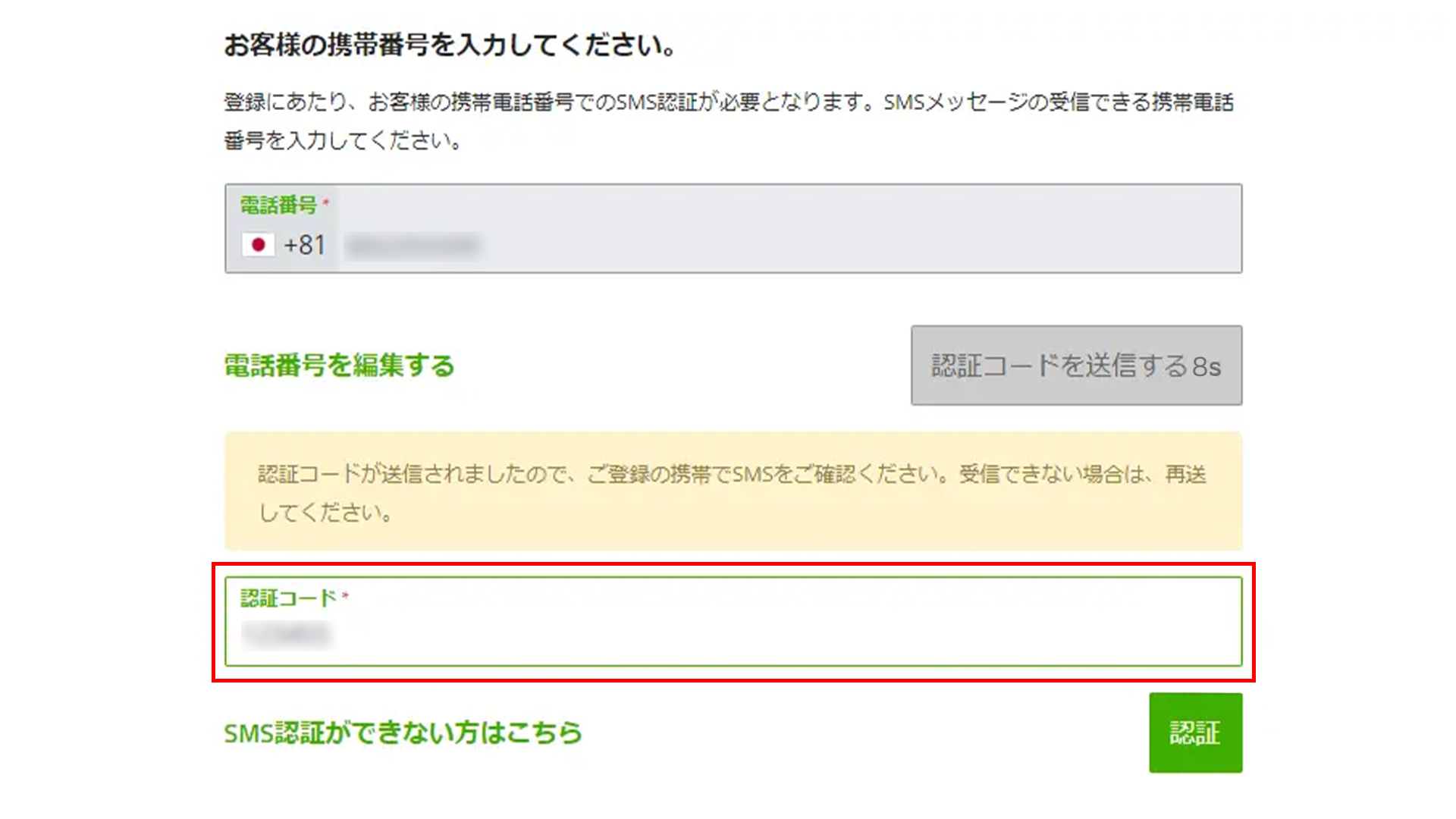 電話番号のSMS認証を完了する