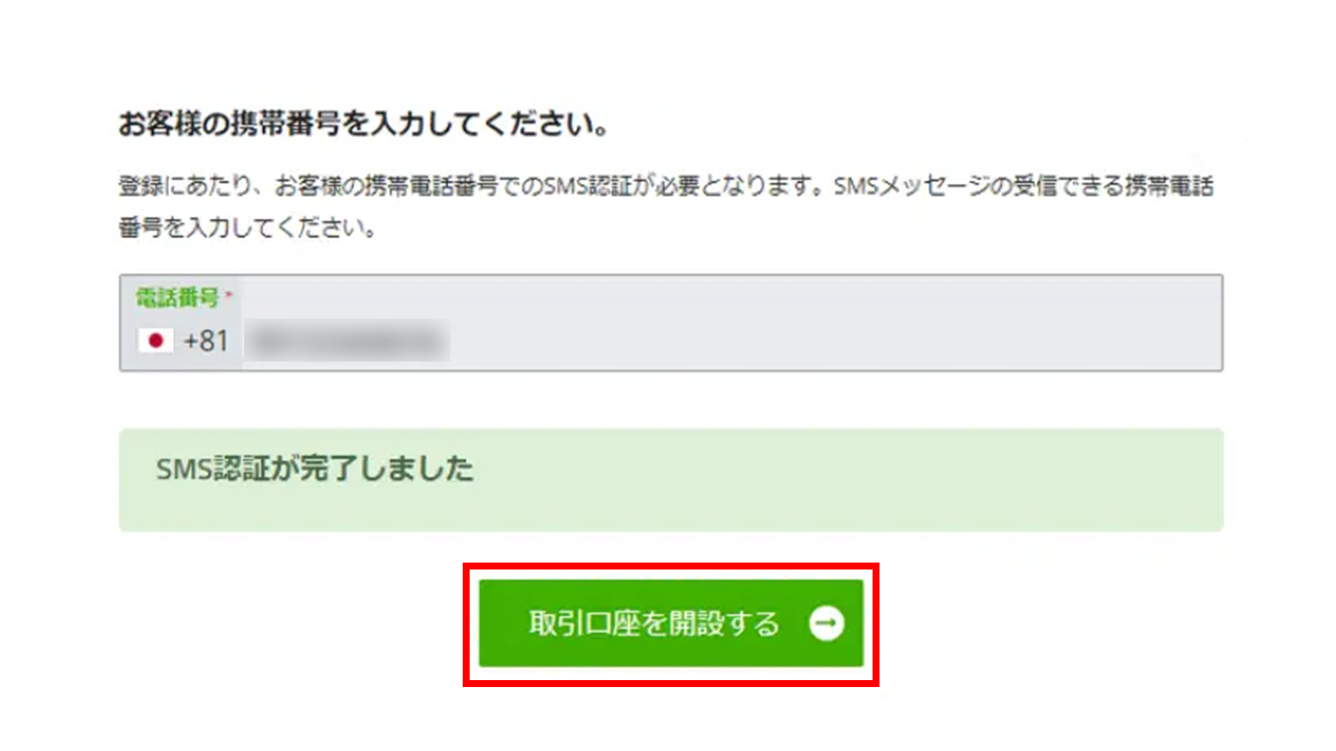 電話番号認証が完了したら、「取引口座を開設する」ボタンをクリックします。