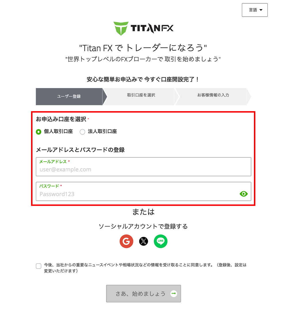 Titan FXの口座開設フォームを開いたら、メールアドレスとパスワードの登録を行います。