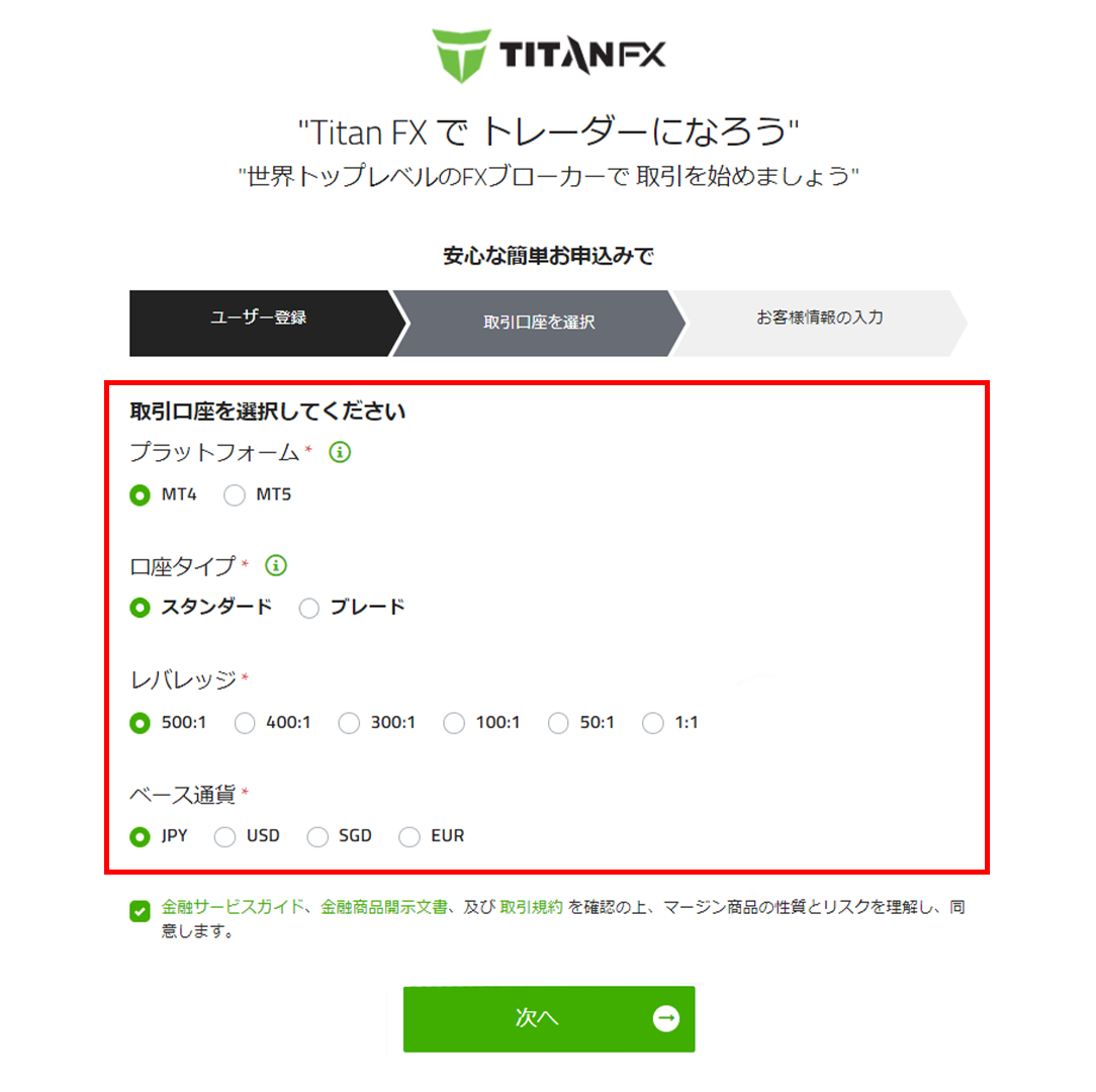 「プラットホーム」「口座タイプ」「レバレッジ」「取引通貨」を選択します。