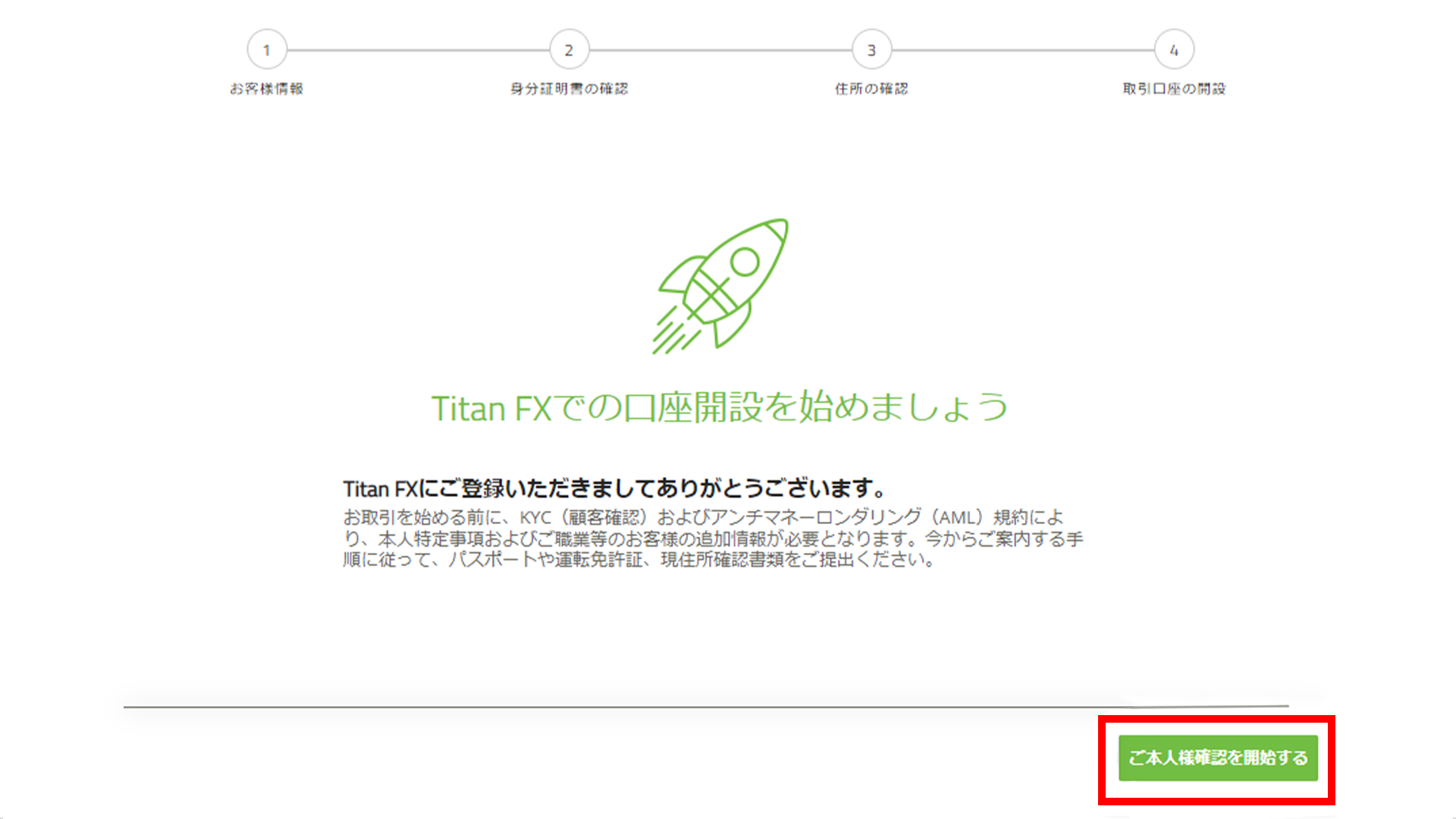 Titan FXのマイページを開くと、本人確認手続きを始める画面が開きます。